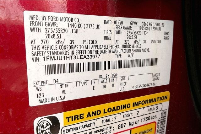 Equipment Group 202A (110V/150W AC Power Outlet, 2 Smart Charging USB Ports In 3rd Row, 2nd Row 40/20/40 Tip & Slide Seat, 3rd Row Power-Folding Head Restraints, 3rd Row Vinyl Seat, ActiveX-Trimmed 1st & 2nd Row Seats, Advanced Security Pack, Chrome Platform Running Boards, Hands-Free Foot-Activated Liftgate, Heated Steering Wheel, Heated/Ventilated Front Seats, Intelligent Access, Power Tilt/Telescopic Steering Wheel, Power-Folding Heated Body-Color Power Mirrors, Remote Start, Santa Cruz Vinyl-Wrapped Center Console Side Rails, Uplevel Instrument Panel Cluster, and Wireless Charging Pad), Expedition XLT, EcoBoost 3.5L V6 GTDi DOHC 24V Twin Turbocharged, RWD, Exterior Parking Camera Rear, Fully automatic headlights, Navigation System, Security system, Speed control, Wheels: 20 Luster Nickel-Painted Aluminum, 2nd Row ActiveX Captains Chairs w/Armrest, 3.15 Axle Ratio, 3rd row seats: split-bench, 4-Wheel Disc Brakes, 6 Speakers, ABS brakes, Air Conditioning, AM/FM radio: SiriusXM, Auto High-beam Headlights, Auto-dimming Rear-View mirror, Automatic temperature control, Brake assist, Bumpers: body-color, Cloth Front Captain's Chairs, Compass, Delay-off headlights, Driver door bin, Driver vanity mirror, Dual front impact airbags, Dual front side impact airbags, Electronic Stability Control, Emergency communication system: SYNC 3 911 Assist, Four wheel independent suspension, Front anti-roll bar, Front Bucket Seats, Front Center Armrest, Front dual zone A/C, Front fog lights, Front reading lights, Garage door transmitter, Heated Body-Color Power Mirrors, Heated door mirrors, Illuminated entry, Leather steering wheel, Low tire pressure warning, Occupant sensing airbag, Outside temperature display, Overhead airbag, Overhead console, Panic alarm, Passenger door bin, Passenger vanity mirror, Power door mirrors, Power driver seat, Power steering, Power windows, Radio data system, Radio: AM/FM Stereo w/MP3 Capable, Rear air conditioning, Rear anti-roll bar, Rear reading lights, Rear window defroster, Rear window wiper, Reclining 3rd row seat, Remote keyless entry, Roof rack: rails only, SiriusXM Satellite Radio, Speed-sensing steering, Speed-Sensitive Wipers, Split folding rear seat, Steering wheel mounted audio controls, SYNC 3 Communications & Entertainment System, Tachometer, Telescoping steering wheel, Tilt steering wheel, Traction control, Trip computer, Variably intermittent wipers, Voice-Activated Touch-Screen Navigation System, and Voltmeter.